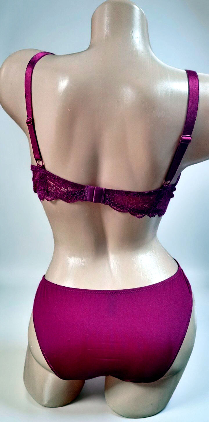 Комплект нижнего белья, состоящий из бюстгальтера с эффектом пуш-ап и трусиков. Размер 90B, цвет фиолетовый.