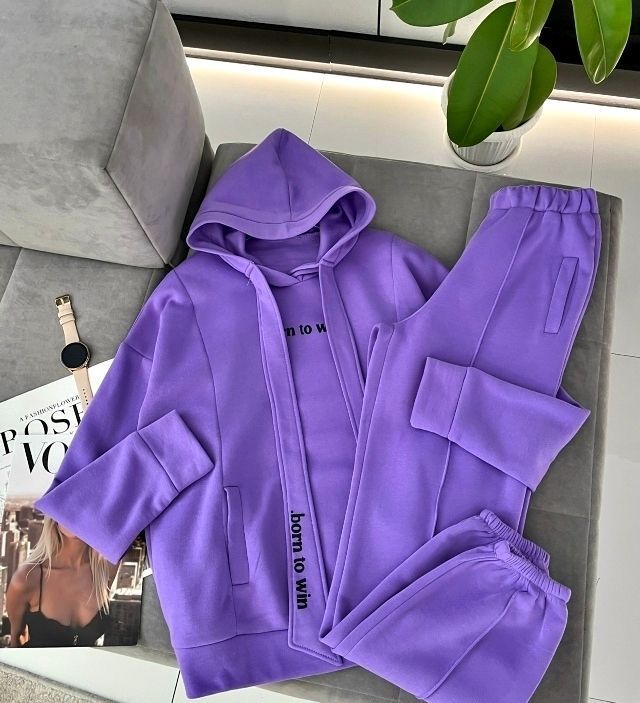 Погрузитесь в комфорт и тепло сиреневого костюма-двойки с уютным капюшоном и практичными карманами. Утепленный флисом, он станет Вашим надежным спутником осенью, зимой и весной. Надпись «Born to Win» подчеркнет Вашу уверенность и стремление к победе! Стильный акцент Вашего образа!