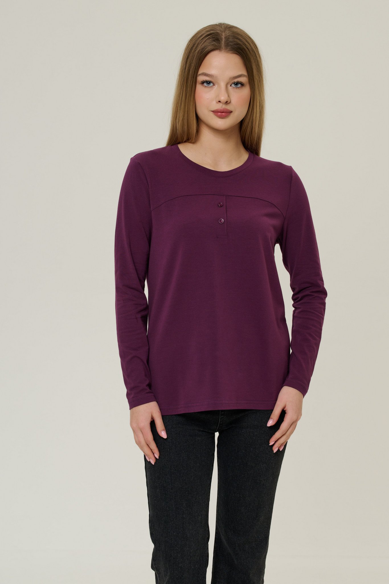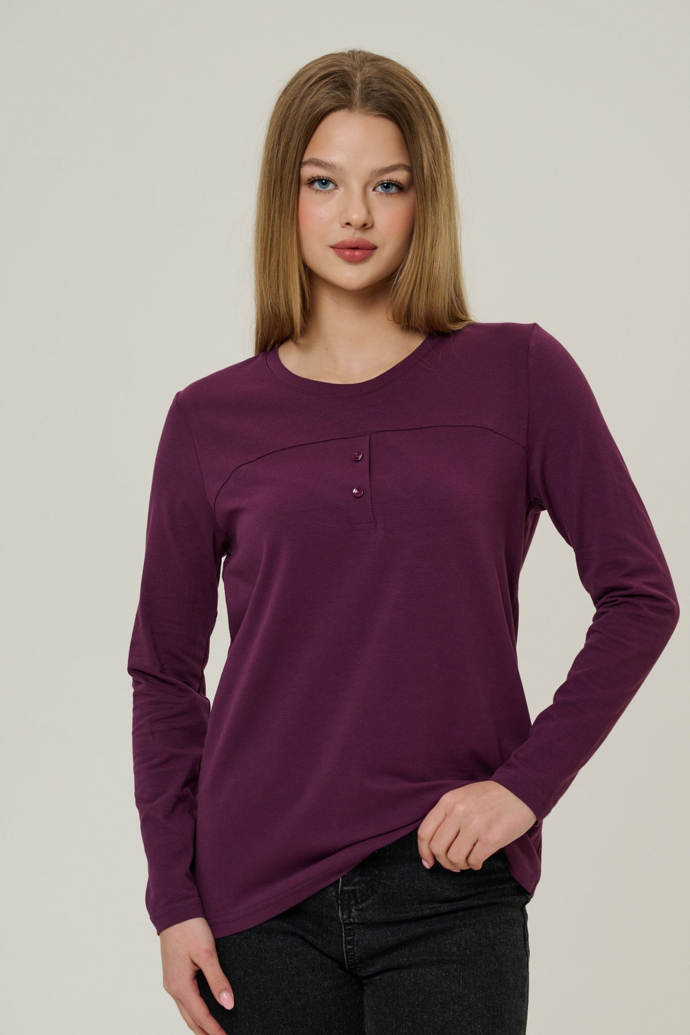 Представляем Вашему вниманию стильный лонгслив фиолетового цвета из мягкого трикотажа (92% х/б, 8% пэ). Прямой силуэт подчеркнет элегантность фигуры, а круглая горловина и втачные рукава подарят комфорт при носке. Пуговичная застежка добавляет изделию особого шарма. Производство — Россия. Подходит для весны и осени.