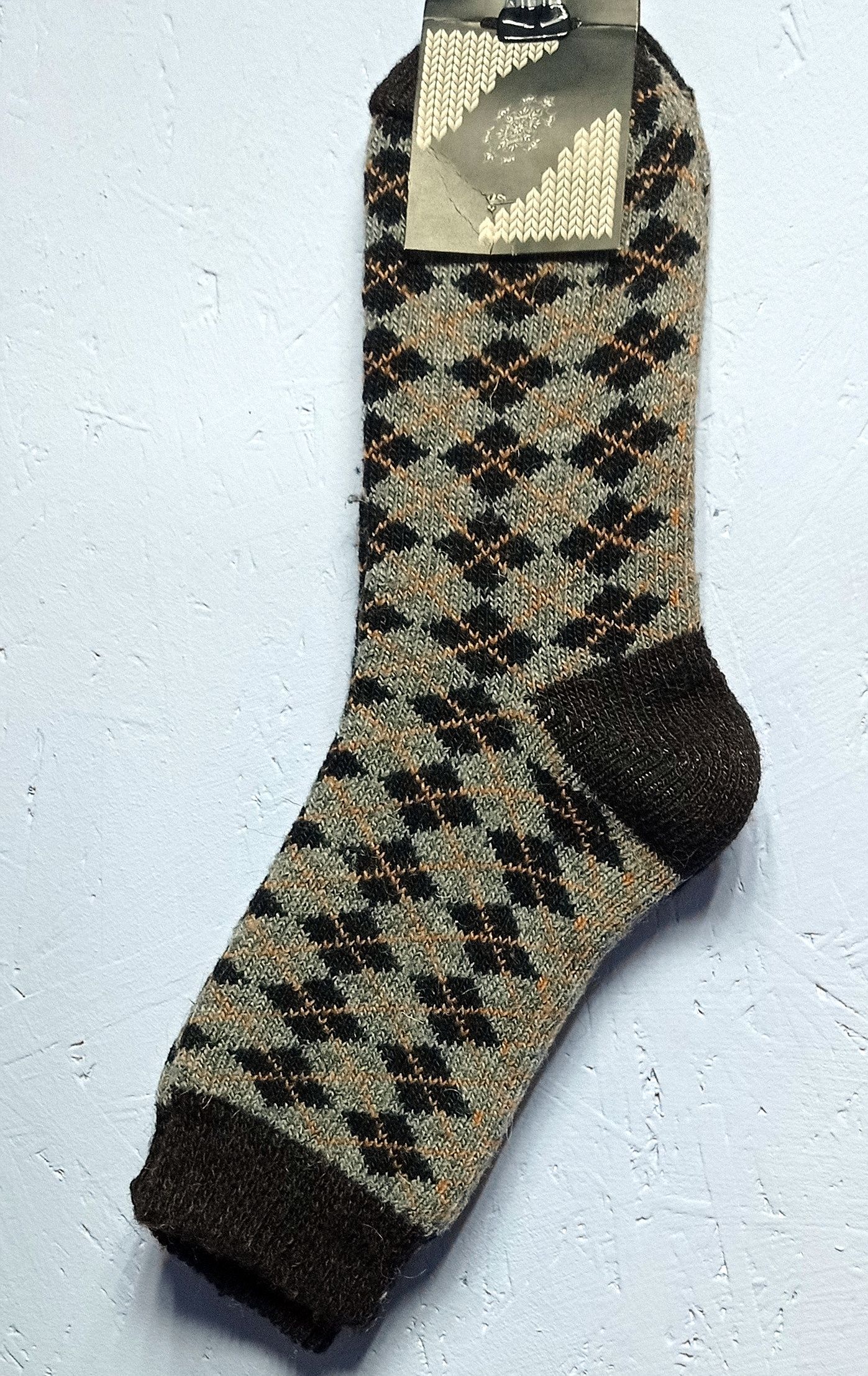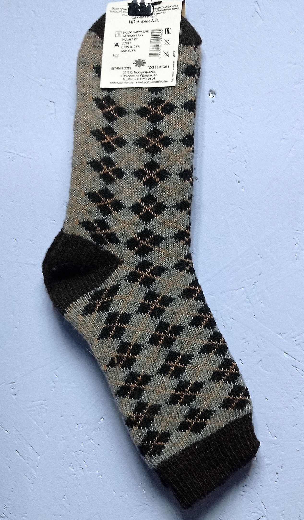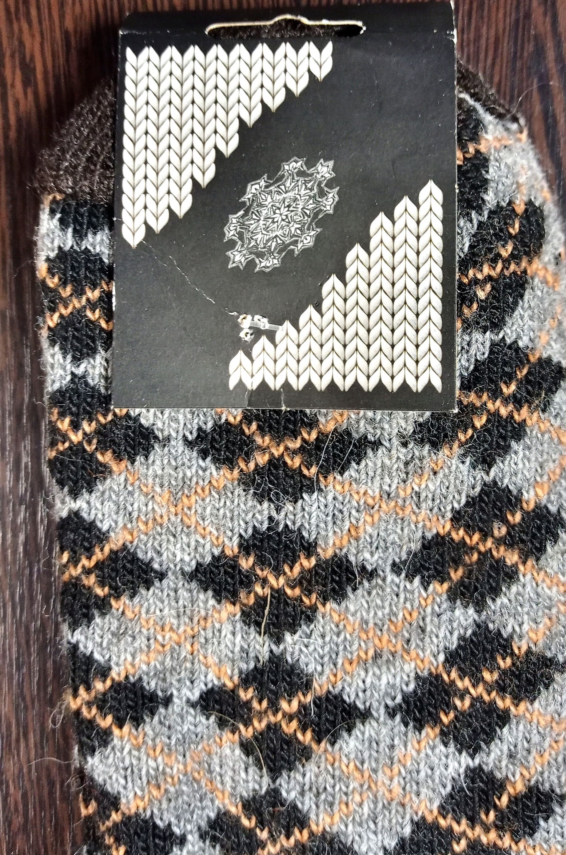 - 41 - 42, цвет серо-коричневый с ромбами: шерсть (95% шерсть, 5 % акрил).