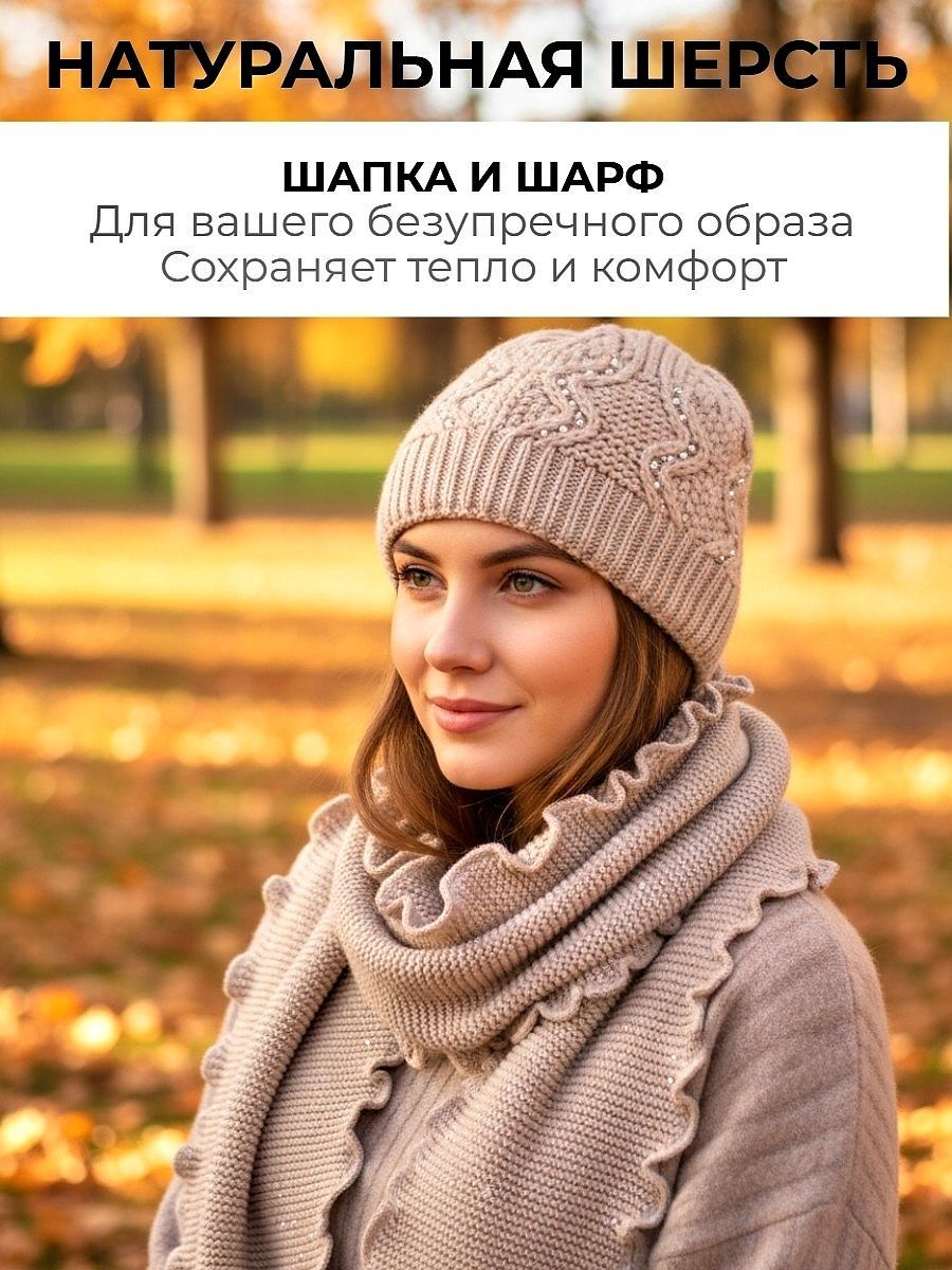 Элегантное сочетание женской зимней шапки и шарфа цвета охры. Изящно подчеркните свой образ натуральной шерстью, которая подарит комфорт даже в самые холодные дни. Пусть этот комплект станет вашим верным спутником в создании модного и теплого образа этой зимой!